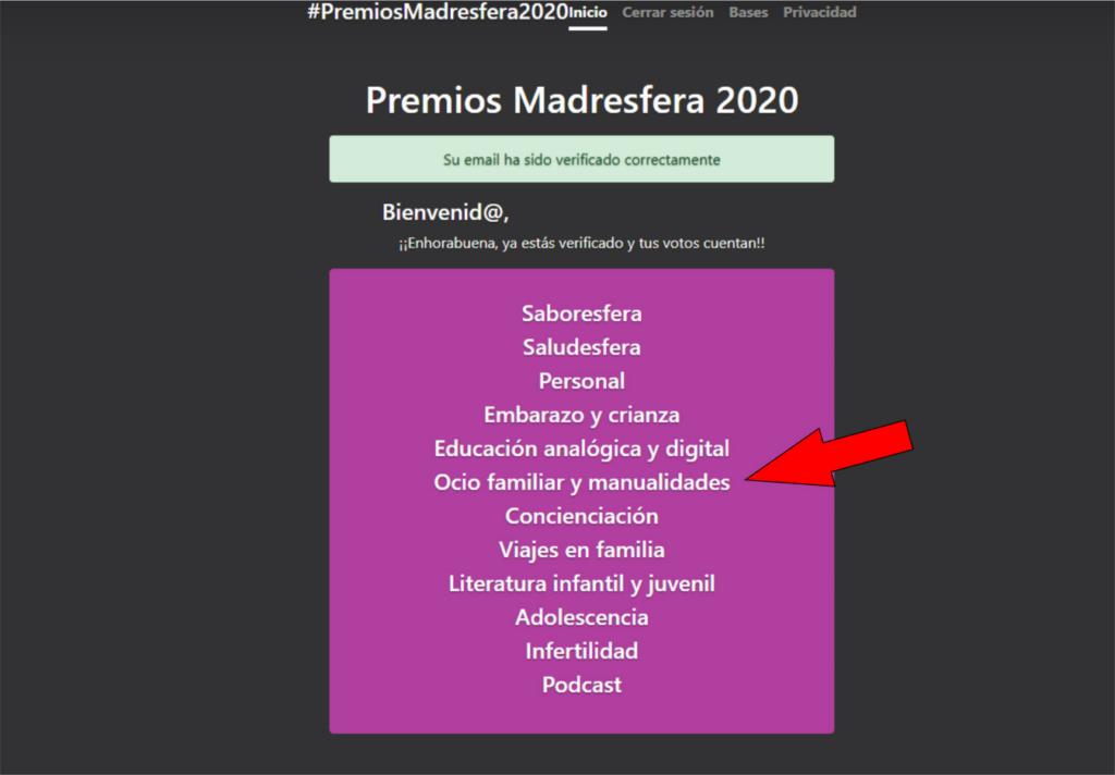 Cuando le des a VALIDAR cuenta desde tu email, directamente te saltará a la ventana de votaciones. Tendrás que escoger la categoría Ocio familiar y manualidades.